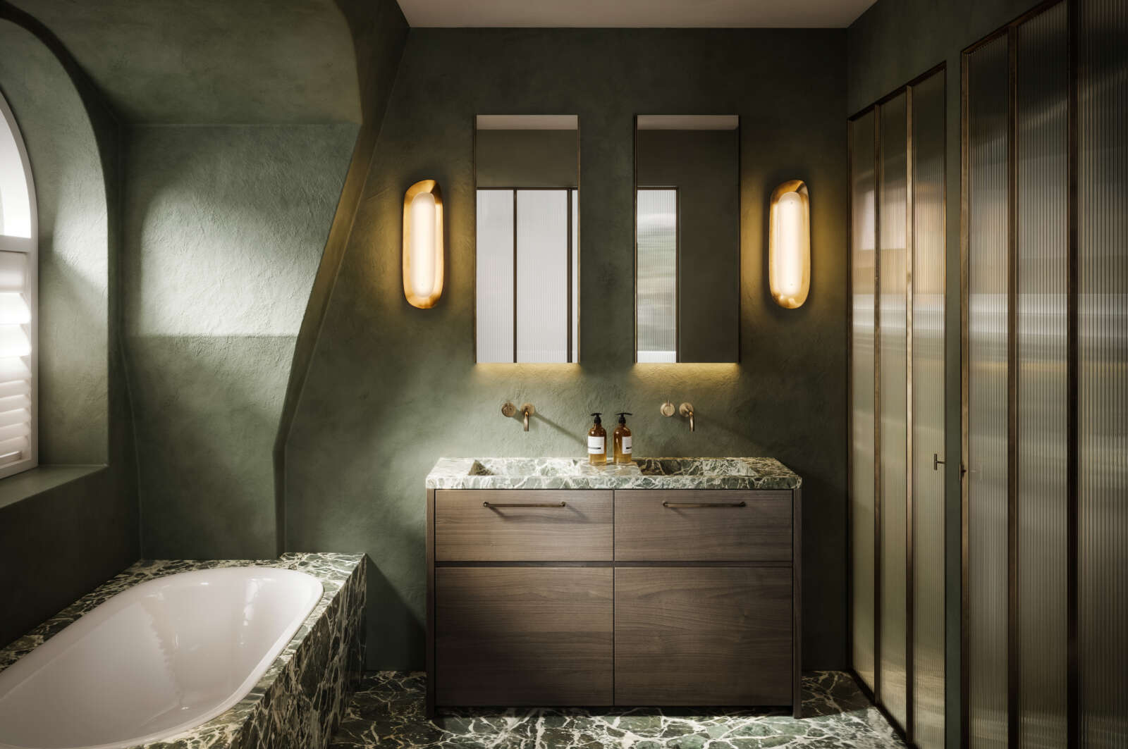 De nieuwe volumes worden opgetrokken uit hoogwaardige materialen, zoals natuursteen en bronskleurig schrijnwerk, wat zorgt voor een warme en verfijnde uitstraling die harmonieus aansluit bij de omgeving.